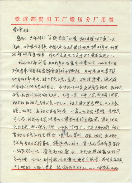 不知“向日本国要求受害赔偿”内容中包不包括我们革命烈士亲属这一部分。如果包括我们,我和哥哥在有生之年,尚可代表我们的家庭在受到多年内心创伤时给以微限的弥补。如果不包括我们,我们也将参加为中国人民伸张正义的行列,在“向日本国要求受害赔偿”书上签名。请您代我们用笔!