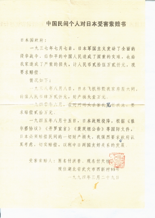 中国民间个人对日本受害索赔书