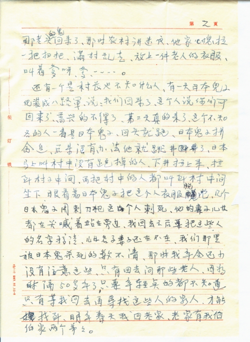 接到您的信后我去年曾去一信,本想今年回老家去一次,把有些问题弄清,我的父母一同被杀的都叫什么名字,还有不是和他们一起死去也弄清楚,可是我今年夏天老病复发,我85年得了糖尿病,一直在吃药打针,现在好一些了,我准备明春回去,在这一年的时间里我回[忆]起许多往事,我记得记不清[哪]一年,我村和饶安公路靠近,公路被游击队破坏,日本鬼子来了,村中只有一个老头,记不清他的名字,被日本鬼子抓住,把头砍掉,挂在公路的电线杆上,老头的家中把老头做了棺木给他安葬,可是没有头,就用面粉做了一个头,画上眉眼,那时我还年幼,还到别家去看,后来村中的人没有不落泪的,我也想起自己的父母也是被日本杀这样短小,不由自主的泪水,也直流不停,到后来日本人把人头挂了三天,村内派人去说和,才把人头放下,这才把人头放在棺材内,脸上的[肉]和眼睛,都没有了,被乌鸦吃剩下的也就干了,后来这家人每天晚上碗筷叮[当]响说:那老头的鬼回来了,那时农村讲迷信,他家儿媳拉一把扫把,满村乱走,放上一件老人的衣服,叫着爹呀、爹……。