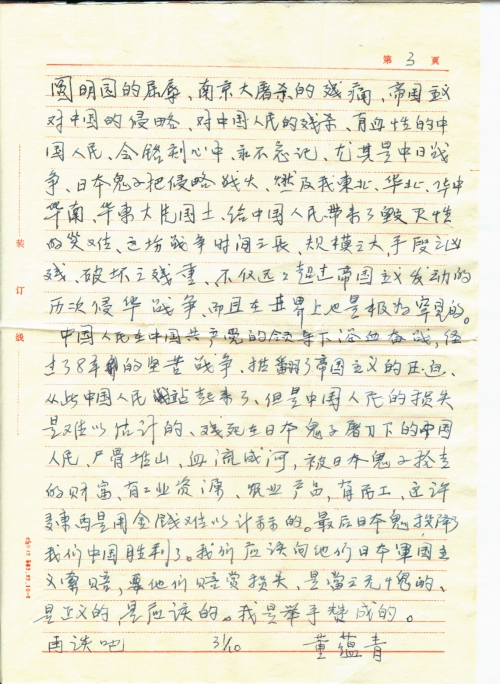 还有一个是村长也不知什么人,有一天日本鬼子化装成八路军,说:我们回来了,这个人说你们可回来了,高兴的不得了,第二天真的来了,这个不知名的人一看是日本鬼子,回头就跑,日本鬼子拼命追,后来没有办法他就跳井了,日本马上叫村中没有跑掉的人,下井拉上来,拉到村子中间,再把村中的人都叫到村中间坐下,眼看着日本鬼子把这个人衣服脱光,几个日本鬼子用刺刀把这个人刺死,他的妻子儿女都在哭喊着站在旁边,我回去之后要把这些人的名字搞清,儿女名字妻子还在不在,我们那里被日本鬼杀死的数不清,那时我年[龄]还小没有注意这些,只有回去问那些老人,因为时隔50多年了,只要年轻点的都不知道只有等我回去再寻找这些人的家人,才能找到,明年春天我回老家,老家有我伯伯家两个弟弟。圆明园的屈辱、南京大屠杀的[惨]痛、帝国主义对中国的侵略、对中国人民的残杀,有血性的中国人民,会铭刻心中,永不忘记,尤其是中日战争,日本鬼子把侵略战火,燃及我东北、华北、华中华南、华东大片国土,给中国人民带来了毁灭性的灾难,这场战争时间之长、规模之大、手段之凶残、破坏之[惨]重,不仅远远超过帝国主义发动的历次侵华战争,而且在世界上也是极为罕见的。