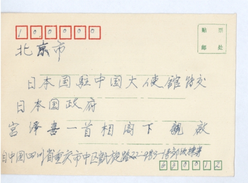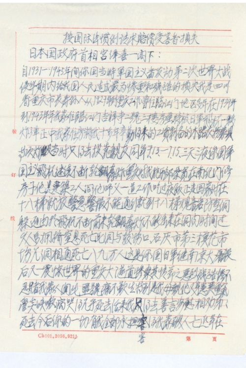 细节:1939年-1943年重庆市遭到日本飞机的多次轰炸,我的房子和家里的一切全部化为灰烬,现寄给日本国首相一封信要求对重庆大轰炸受害者赔偿。