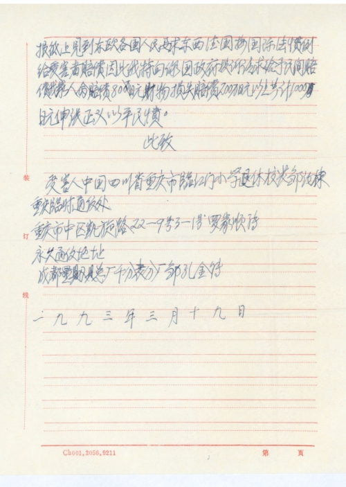 自1931-1945年间你国当时军国主义者发动第二次世界大战侵华期间内给我国人民造成最为惨重和残酷的损失,我是四川省重庆市长寿孙人,从1927年到重庆工作曾住临江门地区多年,在1939年到1943年,我家住临江门吉祥寺二号三楼房屋时被日军飞机一颗炸弹正中我家住房,将我十多年辛勤得来的工资制备的木器衣物家具等项炸毁。当时只得去投靠亲友,同年7.13-7.15三天三夜。你国军国主义飞机继续不断轮[番]轰炸重庆时,我胞弟邹容宽在南纪门修房子,他是建筑工人,同他师父一道工作,吃过夜饭正走回家时,在十八梯就放[紧]急警报不能通行就到十八梯观音岩防空洞躲避。由于飞机不断前来轮番轰炸不能出来,在洞内时间过久,人多拥挤窒息死亡。此洞与较场口,石灰市第三模范市场见洞相通,死亡八九万人,这是你国日军继南京大屠杀后又一震惊世界的重庆大隧道惨案。其情节之恶[劣]残酷,惨不忍睹,我家人闻此噩耗痛不欲生,特别是我母亲,[她]又身患严重气管炎,咳嗽病哭得几乎死去活来,我只得去善言安慰,相劝弟弟死去今后你的一切有我全部承担。害的我家破人亡,近年报纸上见到东欧各国人民要求东西法国按国际法惯例给受害者赔偿,因此,我特向你国政府投诉请求给予民间赔偿,我家人命赔偿800万日元,财物损失200万日元以上共计1000万日元。伸张正义以平民愤。