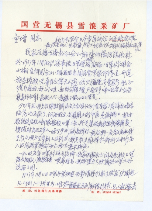 1937年11月11日日军进军快速,为郭清我们家乡沿京沪国道凡二册1-3华里内,唯恐[隐]蔽见不到射程目标,见人就枪击。村落房屋被烧,我的家族父老惨死者众多。