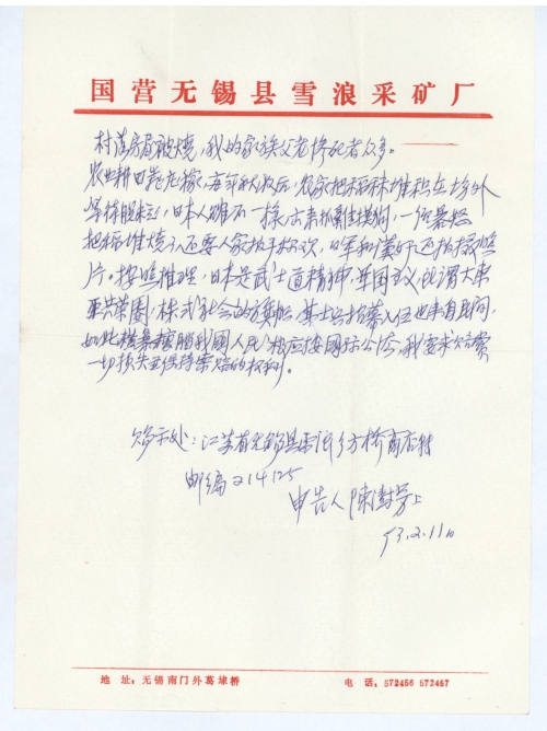 1943年间,我兄长陈树渊原在六合县任测量导线,因战乱南京隔荡迁返家了,河泾里住,在凤凰山行中医[勉]强糊口。当时被我敌后抗日部队枪杀日军三名,于是遭歇斯底里极端报复,搜捕村民五百多人,逐个严刑威逼拷打,最后剩一名老娓和我兄长,从喉到全身刺上五刺刀,我兄长力图挣扎爬行,不料陷入田间泥沼绝命而亡,而今墓木栱矣。