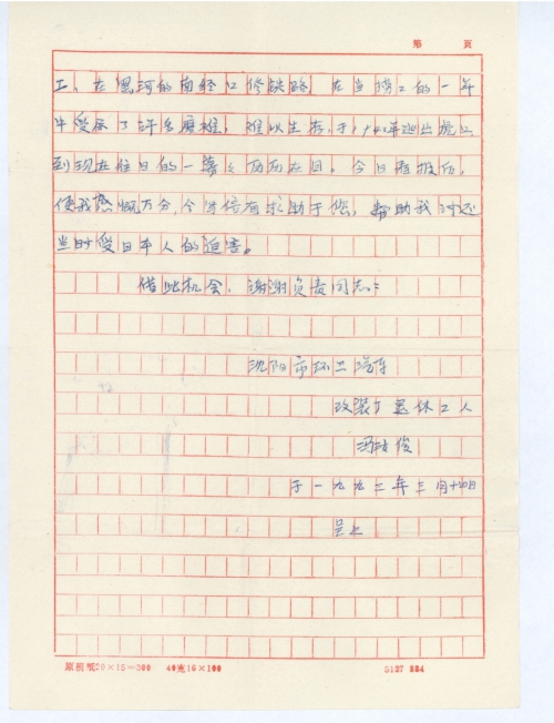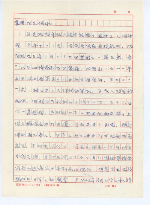 我是沈阳市环卫汽车改装厂退休工人冯汝俊,今年七十二岁,在茶余饭后看报纸时,沈阳报九三年二月二十七日登载了一篇文章,看了以后心情感到万分震痛,回想起一九四〇年,我在河北省景县乡赵庄居住时,当时二十一岁,被日本人大讨伐的军队,当成八路军给抓住,用战刀在我的头上砍了一刀,至今仍留下一道疤痕,当时被日本人把我倒绑在梯子上,用三桶凉水边打边灌,使我失去了知觉,眼部冲血,看不着人。日本人走了,老乡们才把我抬到家里,当时有冯印田,冯延喜。回来一个月以后才会走路,当时在河北活不下去了,因此带领全家老小逃离家乡来到东北沈阳,但是怎么也没有逃出日本人的魔掌。于1942年被日本人抓劳工,在黑河的南经口修铁路。在当劳工的一年中,受尽了许多磨难,难以生存,于1943年逃出虎口,到现在往日的一幕幕历历在目。今日看报后使我感慨万分,今写信有求助于您,帮助我讨还当时受日本人的迫害。
