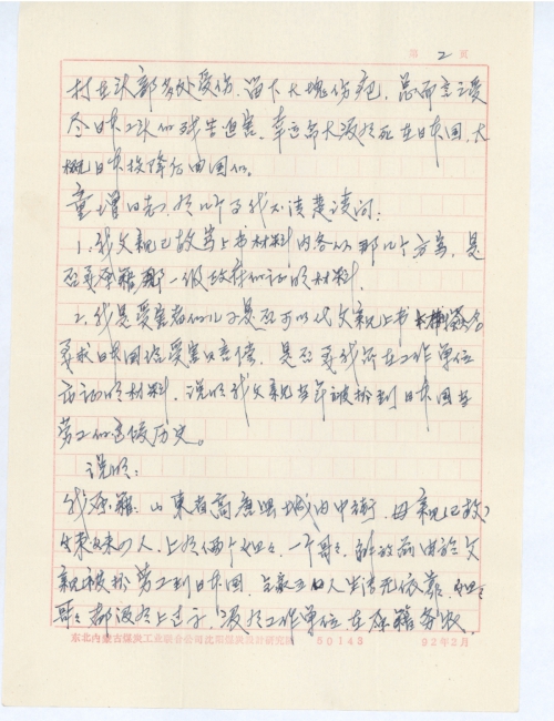 我原籍:山东省高唐县城内中街,母亲(已故),妹妹四人,上有俩个姐姐,一个哥哥,解放前由于父亲被抓劳工到日本国,全家五口人生活无依靠,姐姐哥哥都没有上过学,没有工作单位,在原籍务农。只有我解放后才读了几年书,参加了革命工作,现在(沈阳煤炭设计研究院工作)。因此首次去信联系,特请您和陈健等同志协助我为已故受害的父亲坚决寻求向日本国受害赔偿签名,直到日本国正式谢罪和进行赔偿为止。
