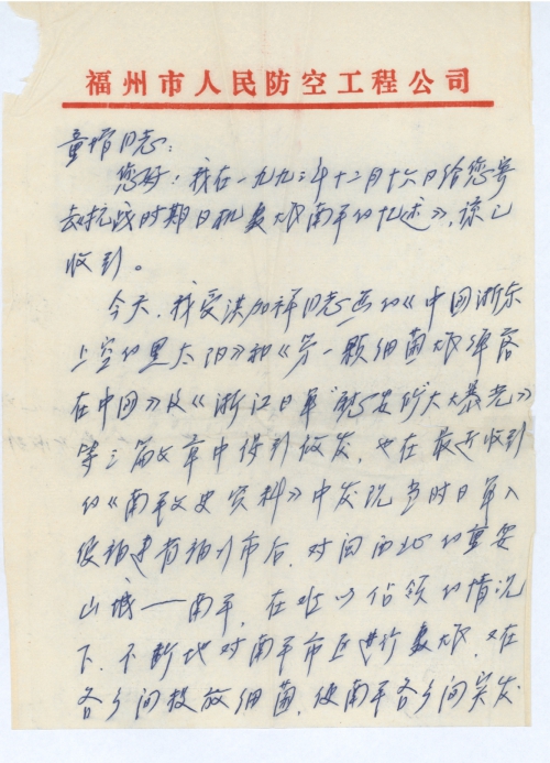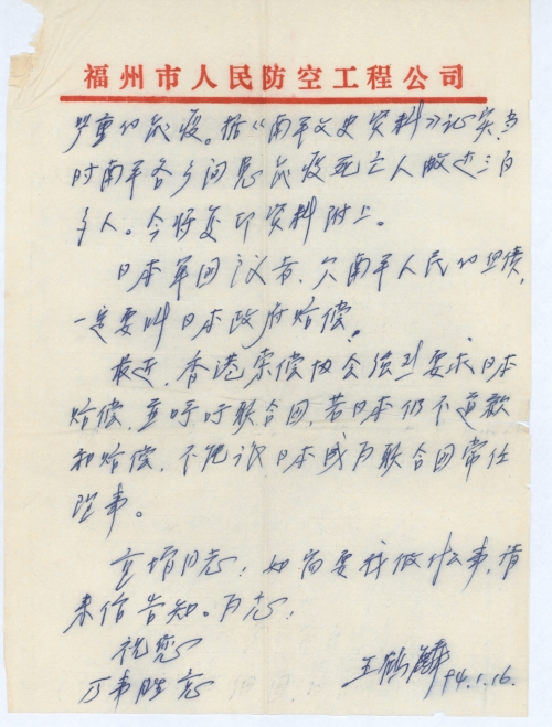 我在一九九三年十二月十六日给您寄去《抗战时期日机轰炸南平的忆述》,谅已收到。