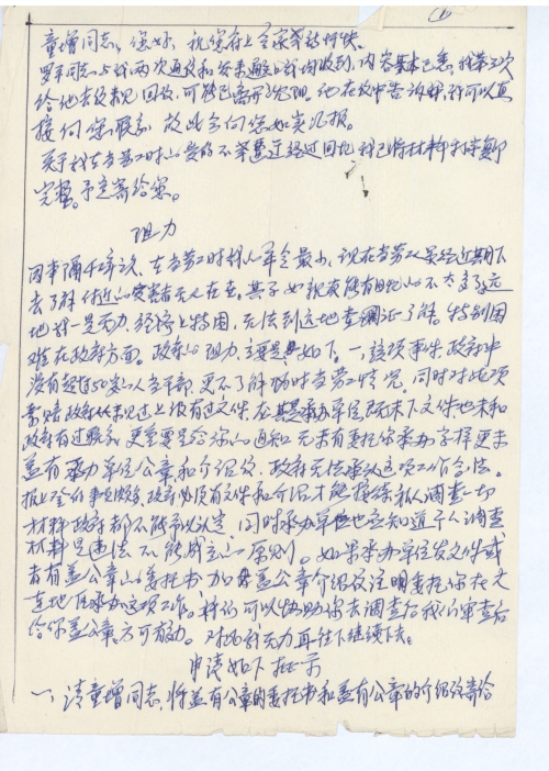 由于我七岁开始讨饭生涯对旧社会的残酷剥削,在我幼小心灵上就打下了深刻的烙印,我未进过校门,是共产党解放了我们全国劳苦大众,我是其中一员,我在解放后46年给共产党八路军当过向导,47年参加土改时在扫盲中,学了几个汉字,对写信写文章困难颇多,请您理解我的晚年不幸遭遇。我于70年遭车祸致残终身。在事故处理中我又遭到徇私枉法和“行帮”组织的残害。我被致残终身只给我36元,而我的应得工资被非法克扣和剥夺每月近300元。我现只有144.30元工资,还不能及时得到手。我的生活相当贫困。我老伴年已72岁,整天在垃圾堆上捡媒渣烧饭,取暖。我的生活是全大连市第一贫穷户。我也想通过老年人研究中心能与人大(全国)常委会和国务院大会等取得联系能解决我的问题。我将在四月去您处详谈。我要依法处理就可以或者低于同等车祸事故处理案例。望童增同志您能同情我的不幸遭遇。