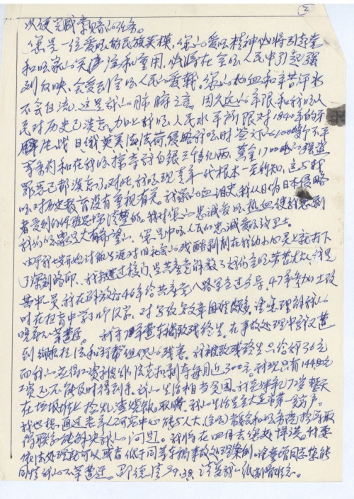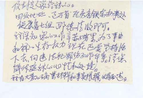 因事隔42年之久,在当劳工时我的年龄最小,现在当劳工人员经近期下去了解附近的受害者无人在世。其子女亲友能有回忆的不太多了。远地,我一是无力,经济上特困,无法到远地查证了解。特别困难在政府方面。政府的阻力,主要是如下:一,该项事件,政府中没有超过50岁的人当干部,更不了解伪时当劳工情况。同时对此项索赔,政府从未见过上级有过文件,尤其是承办单位,既未下文件,也未和政府有过联系,更重要是给你的通知无未有委托你承办字样,更未盖有承办单位公章和介绍信,政府无法承认这项工作合法。报上登的事项颇多,政府必须有文件和介绍才能接待,私人调查,一切材料政府都不能予以认定。同时承办单位也应知道个人调查材料是违法不能成立的原则。如果承办单位发文件或者有盖公章的委托书,加盖公章介绍信注明委托你在大连地区承办这项工作。我们可以协助你,去调查后,我们审查后,给你盖公章,方可有效。对此我无力再往下继续下去。