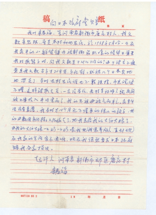 我叫宋春福,系河南省新乡市唐庄村人,我父亲宋器林,原是本村种地农民,于1938年5月份一天在我家开的小杂货铺内被新乡飞机场的侵华日军来我村抓鸡子时,问我父亲是干什么工作的?由于语言不通,并且我父亲当年才20多岁,年年轻轻就被几个日本兵把他带走了,当时农村农民谁也不敢阻拦,而且说话不懂。这样被抓去后,一去没音信,据村里证明人说夜间被日军投入井内害死了,我的老祖母被气死身亡。家里生活没有着落,我当时才10个月还不懂事的很小的孩子,我的母亲因年纪轻轻又改嫁走了,把我丢给我的大伯大娘了,由我的大伯大娘一口奶一口奶喂我,把我恩养成人,直到现在我家的生活实在困难,现在我强烈要求日本政府赔我全家损失。