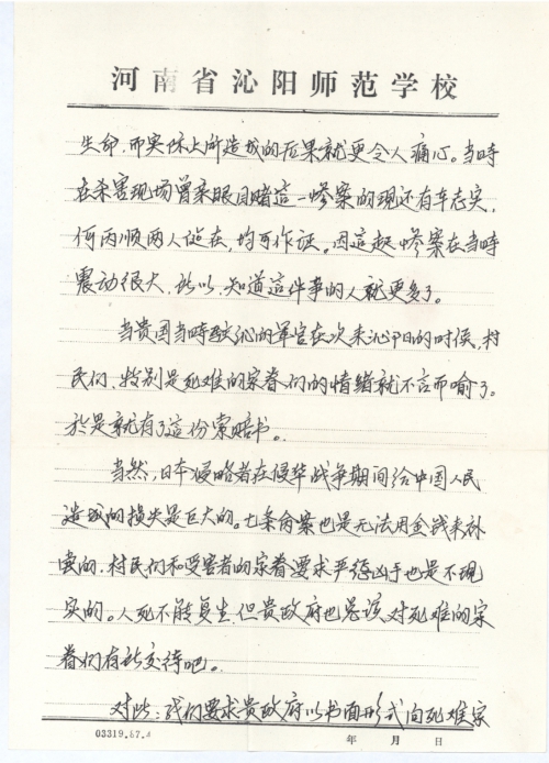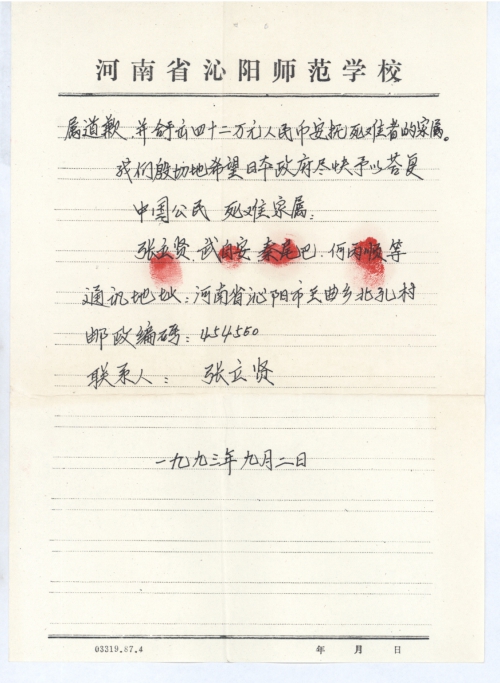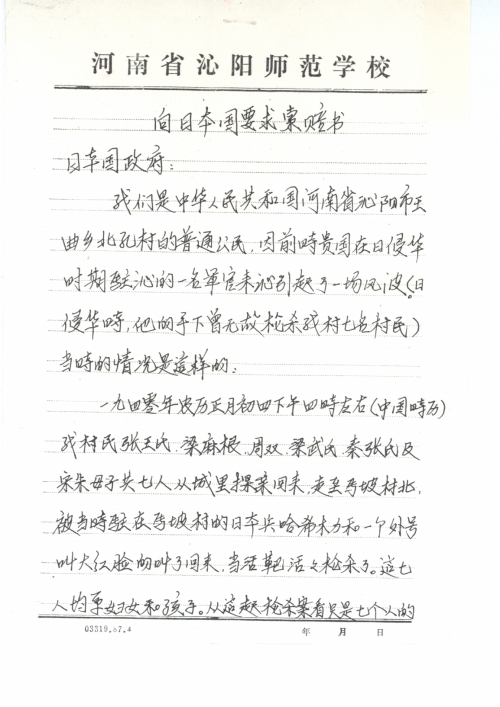 当贵国当时驻沁的军官在(“在”编辑为“再”)次来沁阳的时候,村民们,特别是死难的家眷们的情绪就不言而喻了。于是就有了这份索赔书。