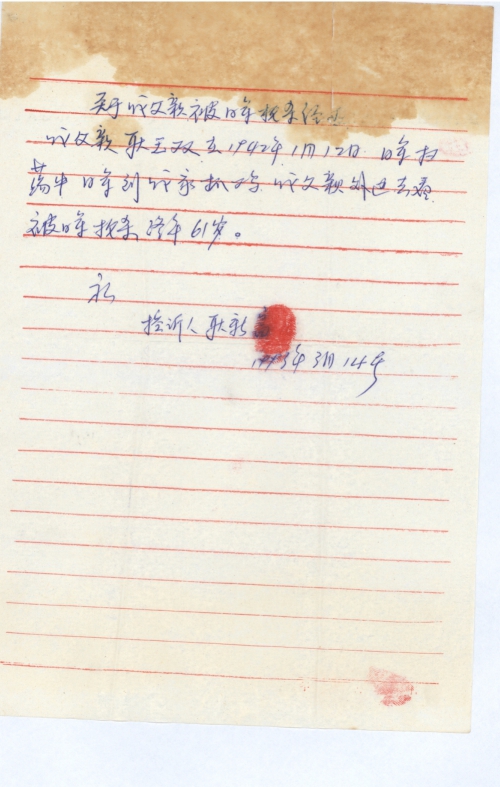 21 10 月, 2018 s1529 Share EmailTwitterFacebookGoogle +PinterestTumblrLinkedinVkontakte 信扫描序列号:s1529 写信日期:1993-03-14 写信地址:信中未提 受害日期:1942-01-12 受害地址:信中未提 写信人:耿新富 受害人:耿玉双(耿新富的父亲) 类别:谋杀(MU) 细节:1942年日本鬼子扫荡我家乡时到我家抓鸡,父亲被日本兵枪杀。备注:信封丢失 关于我父亲被日军枪杀经过 我父亲耿玉双在1942年1月12日,日军扫荡中,日军到我家抓鸡,我父亲外进去看,被日军枪杀,终年61岁。 礼 控诉人 耿新富(手印) 1993年3月14号 21 10 月, 2018 10000cfj_3o5som 谋杀(MU)