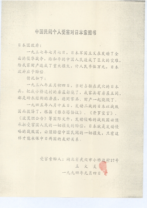 中国民间个人受害对日本索赔书