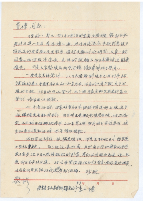 给你寄这封信,依据是报纸,你是否能收到,我思想上有怀疑。为了把这事办成,当然离开党和国家的支持,最主要是你主动热情积极的引导,我们必须联合起来,统一思想向日本声讨公道。所以希望你接信后千万寄来你的通信地点。以后我们去京拜访或通信有些依据。