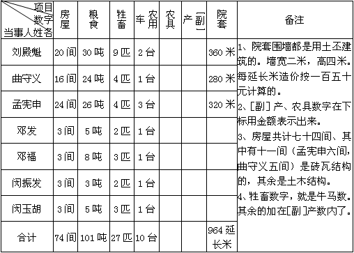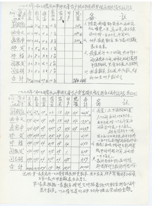 说明:第一表是统计一切受害损失物资数字,其中农具、[副]产等项目多不好填,在第二表内用金额表示出来了。
