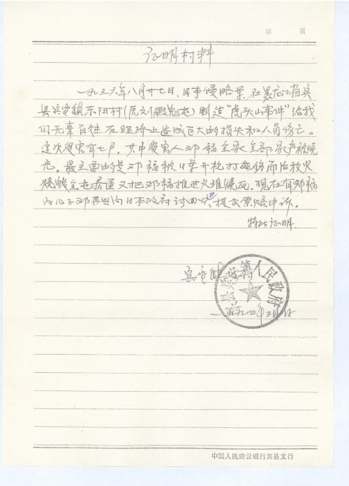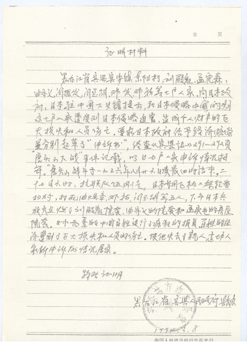 一九三六年八月廿七日,日本侵略军在黑龙江省宾县宾安镇东阳村(原刘殿魁屯)制造“虎头山事件”给我们无辜百姓在经济上造成巨大的损失和人员伤亡。这次受害有七户,其中受害人邓福全家全部家产被烧光。最主要的是邓福被日军开枪打伤而后放火烧毁全屯房屋又把邓福推进火堆烧死。现在有邓福的儿子邓再兴向日本政府讨回公道,提出索赔申诉。