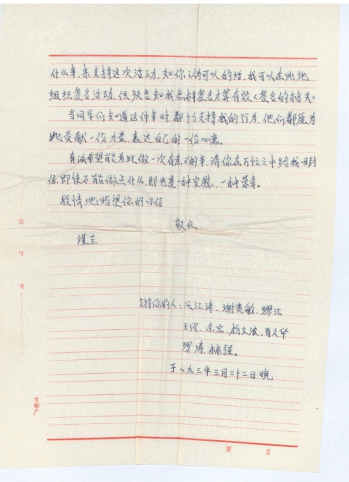 从报纸上得知你将组织这场理直气壮的索赔活动。我十分高兴,当知你将组织万人签名,我想我应该做一点什么事来支持这次活动,如你认为可以的话,我可以在此地组织签名活动,但须告知我怎样签名才算有效<签名的格式>。