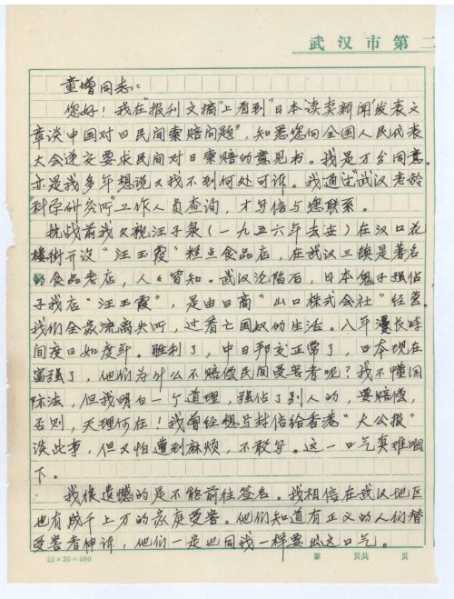 我在“报刊文摘”上看到“日本‘读卖新闻’发表文章谈中国对日民间索赔问题”,知悉您向全国人民代表大会递交要求民间对日索赔的意见书。我是万分同意。亦是我多年想说又找不到何处可诉。我通过“武汉老龄科学研究所”工作人员查询,才写信与您联系。