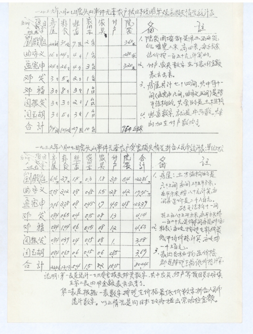 Note: The first table gives a summary of all damage losses and materials, wherein farm tools and by-products are not convenient to list and are indicated in amount in the second table.