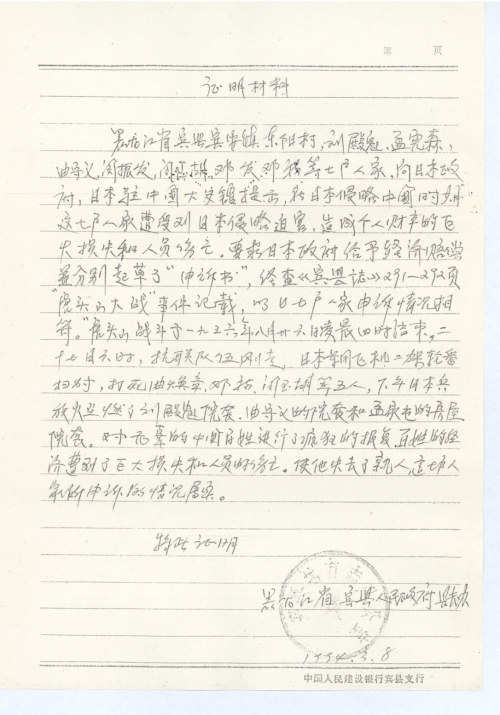 Seven households of Liu Diankui, Meng Xiansen, Qu Shouyi, Min Zhenfa, Min Yuhu, Deng Fa, and Deng Fu in Heilongjiang Province Bin County Bin’an Town Dongyang Village, toward the Japanese government, and the Japanese Embassy in China, during the Japanese invasion into China, these seven households suffered persecution from the Japanese invaders, which resulted in huge loss of personal property and human casualty. We demand the Japanese government to give economic compensation for which we have respectively drafted “Letter of Petition”, upon search of Page 291-292 “Hutoushan Battle” incident records in “Bin County Annals”, the facts tally with the claim details filed by the above seven households. “Hutoushan battle was concluded at 4 o’clock in the early morning of August 26, 1936, at 6′ o’clock on August 27, immediately after the Anti-Japanese United Army left, two Japanese military aircrafts sprayed bullets with machine guns, killed five persons including Qu Huanzhang, Dengfu, and Min Yuhu, in the afternoon the Japanese soldiers set fire to Liu Diankui’s compound, Qu Shouyi’s compound and house compounds in Mengjiatun, and executed frantic retaliation toward innocent Chinese civilians, the people suffered huge loss in livelihood and human casualty. He lost his endeared ones, the facts stated by these seven households are true.