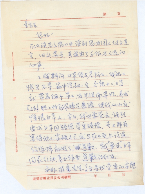 二战期间,日本侵占老河口,我奶奶惨[遭]不幸,家中洗劫一空。父亲十二、三岁就带着俩个弟弟为生活而奔忙,养成在外胆小怕死,在家脾气暴躁。使我从小就憎恨日本人。今日,我也要签名,强烈要求日本国赔偿受害赔偿。世上[哪]有害得他人家破人亡,就只在口头上说道。给您添麻烦了,道歉,我们要求日本国在行动,真正作出道歉的行为。