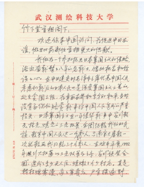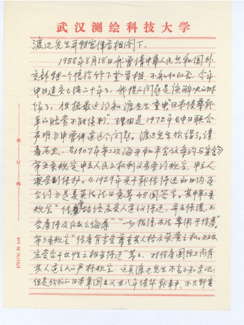 1988年8月18日我曾请中华人民共和国外交部转一个信给竹下登首相,不知收到否。今年中日建交已经二十年了,我提的问题是该解决的时候了,但据最近得知渡先生重申:“日本侵华战争的赔偿不能谈判”理由是1972年《中日联合声明》中曾讲到这个问题。渡边先生你错了:请看历史,《1907年第二次海牙和平会议条约与宣言》第五条规定中立人民之权利义务条约规定,中立人要受到保护。《1929年关于战俘待遇的日内瓦合约》是美英法德日意等48国签字。其中第二条规定“俘虏始终应受人道主义待遇,并应保护,不受虐待及民众之侮辱”“一切报复办法禁用于俘虏”。第三条规定“俘虏有享受尊重其人格及荣誉之权,妇女应受合于女性之相当待遇”等等,对俘虏国际上尚有其人道主义的严格规定,这点渡边先生不会不知道吧!但是你们的日本军国主义在八年侵华战争中,不只野蛮的对待俘虏,而且更加野蛮的对待普通的人民,你们把普通人民抓去当劳工,不给饱饭吃,吃的猪狗食,多少人被打死饿死,就计算一下死在你日本的中国劳工有多少,死在东北的矿井、铁路的有多少。中国妇女被你你们军人奸污的有多少,更恶劣的是你们研究细菌武器化学武器拿中国人做试验,死了多少人,在战争中你们实行杀光抢光烧光的三光政策,在内蒙你们制造了多少无人区,在河北山东山西你们杀死了多少无辜的人民,烧了多少村庄,奸污了多少良家妇女,你们的军队丧尽人性和天良。实行禽兽都做不到的惨绝的政策。这些违反国际法不共戴天的深仇大恨永远埋藏在亿万华夏子孙的心目中。