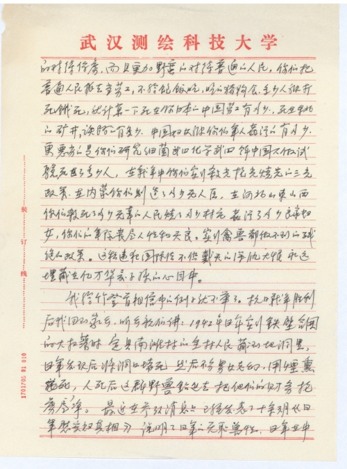 我作为一个参加抗击日本军国主义的侵略,浴血奋战整整八年的老战士,借此机会和你谈谈心。在中日建交时毛泽东主席代表中国人民考虑到战后的日本人民也是深受军国主义之害的,处在贫困之际,为争取世界和东方的和平,当时没有要求你们赔偿战争给中国人民造成的严重损失。日本军国主义在八年侵华战争中实行杀光、抢光、烧光的三光政策,企图征服我们的民族,杀害中国人民达一千多万人,只南京大屠杀一次就杀死我同胞三十多万人。在冀中平原,1942年进行大扫荡以三光政策为主导,实行“铁壁合围”,造成了多少无人区,烧毁了多少村庄。真是村村烟雾漫,家家穿丧衣,尸首横遍野,嚎啕动天地。