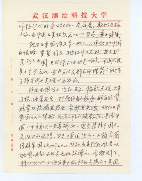 我今年七十四岁了,是一九三七年九月二日参加抗日的。抗战八年我随八路军转战华北西北打了八年,我做过两任武工队队长兼指导员,我所见所闻日寇烧杀掳掠的事实在太多了,埋藏在我心中几十年的仇恨实在太深了。与日本建交后,在北京见到日本的膏药旗恨不得爬上去将它撕碎。为了大局我压抑着自己的感情。1988年8月18日在日本首相竹下登访华时,通过外交部向他转交了我的一封要求赔偿的信。今年1992年4月18日,当看到渡边外相说“赔偿不能谈判”时,我又给渡边写了一封信,因当时身体欠佳未发,今将两封信的底稿抄给你们参考。