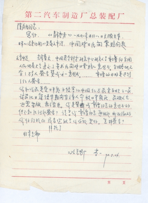 我和我家是受日本鬼子侵害的中国亿万家老百姓之一家。我家在日寇侵华期间有六条人命被日军杀死,家破人亡,逃荒要饭,离乡背井。我是赞成童增同志的意见书的,但不知在何处签名?请告我童增同志通讯处,邮政编码,我将问明白,或者您能告诉明白更好。怎样签名?