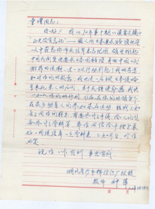 我从92年第十期《读者文摘》“历史没有忘记”——国人向日本要求赔偿纪实一文中获悉你布衣位卑未忘忧国,领头掀起中国民间坚决要求日本国赔偿,并向中国人民谢罪的浪潮。这一正义行动引起了我的共鸣,和对你们的敬意。我也是一名被日本侵略军杀死亲人的后代,出于民族使命感,我决心加入你们的行列,准备在你们的领导下,在家乡动员人们参加签名运动,但我不知怎么同你们联系,需要些什么手续,给人们准备些什么资料等。希你回信给予指导,最好一同随信寄一点资料来,不知可否,盼你回复。