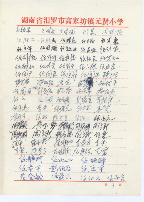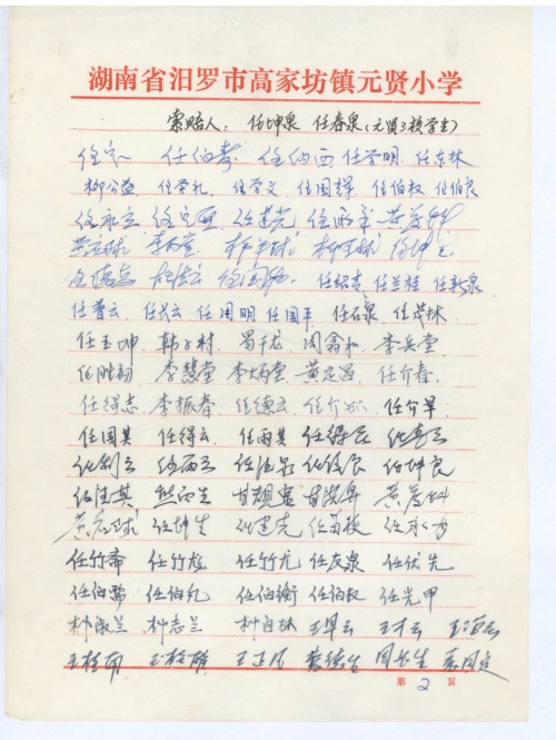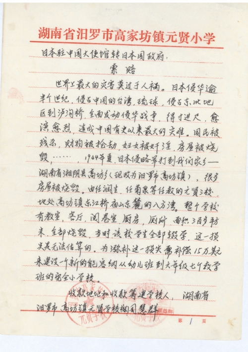 世界上最大的灾害莫过于人祸。日本侵华逾半个世纪,侵占中国的台湾,琉球,侵占东北地区到[卢]沟桥,全面发动侵华战争,得寸进尺,愈演愈烈,造成中国有史以来最大的灾难。国民被残杀,财物被抢劫,妇女被奸淫,房屋被烧毁……,1944年夏,日本侵略军打到我们家乡——湖南省湘阴县高坊乡(先改为汨罗市高坊镇),很多房屋被烧毁。由任润生,任菊泉等任教的元贤三校,地处高坊镇东江桥庙山东麓的八方湾。整个学校有教室,客厅,阅卷室,厨房,厕所,面积三百多平方米,全部烧毁,当时该校学生全部辍学,这一损失是无法估算的。为[弥]补这一损失需补偿15万美元来建设一个新的能容纳从幼儿班到六年级七个教学班的完全小学校。