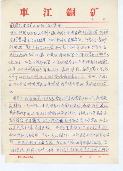 我在湖南妇女报上看到了您访问了中国民间对日“索赔”行动发起人童增先生的报导,当时我的心里很高心,并流出了激动的眼泪,童先生的行动代表和反应了全中国人民和世界各国友好人民的共同心愿,中国人民闷在肚里几十年的苦水从此可以倾吐了,在过去的年代里,中国人民受尽了日本侵略者的残酷迫害,日本侵略者在中国杀人放火,强奸掳抢,真是无恶不作,数以万计的中国人民惨死在日本侵略者的屠刀之下,因此,中国人民对日本侵略者要求民间赔偿是合情合理的,是天经地义的。