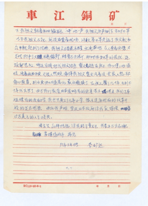 后来,[有]一天,我祖父吃了饭,准备下地,一出门,正碰上一股出来搜[刮]的日军,还没等我祖父反应过来,日本兵迅速掏出手枪,情急之下我祖父朝着[稻]田猛跑,“砰”地一声,我祖父应声倒下当时日军以为我祖父已死,就没有查看现场,许久等日军走远了,我父亲和众乡亲赶到了现场,我祖父已昏迷不醒,血流满地,众人查看伤势,才发现打中了大腿根部,胯骨已打断,那时因为日军的侵扰,连饭都吃不上,哪还有钱[帮]我祖父治疗,整天[躺]在床上,伤口慢慢地溢烂,流着血和脓,又没人照顾,痛的我祖父整天流着泪,全家人愁不已,痛心疾首,到后来伤口日益恶化,最后瘫痪了,在床上磨了几十年,及到了七十年代去世了,由于我们家受日本侵略者的迫害,苦不堪言,我们兄弟姐妹有的没有上学,我也只是上了几年小学,很不适应现在的改革开放的发展形势。由此我声明,要求日本政府给我家赔偿15万美元的人生损失。