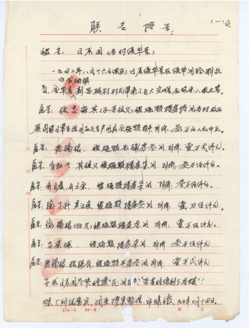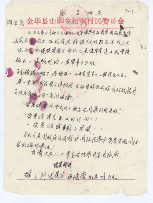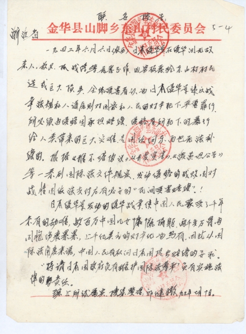 Other details:During the Japanese invasion of China in 1943, the Japanese soldiers burned down houses, killed people, and captured the villagers as prisoners of war. They also killed the villagers with bacterial weapons. They did all manner of evil and committed serious crimes. Now the victims claim for compensation with coalition signature. Note: The envelope was lost.