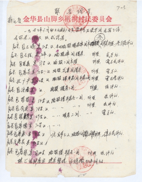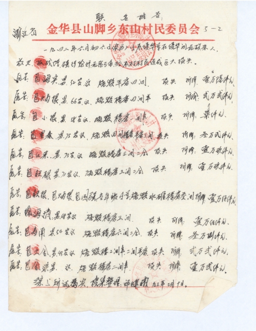 At Zhouliao Village, Zhoucun Town, Langya Township, Jinhua County, Zhejiang Province, on June 6, 1942 lunar calendar, the Japanese Invasion Army Without provocation killed, burned, and committed all sorts of evil crimes, which brought huge loss to villagers.
