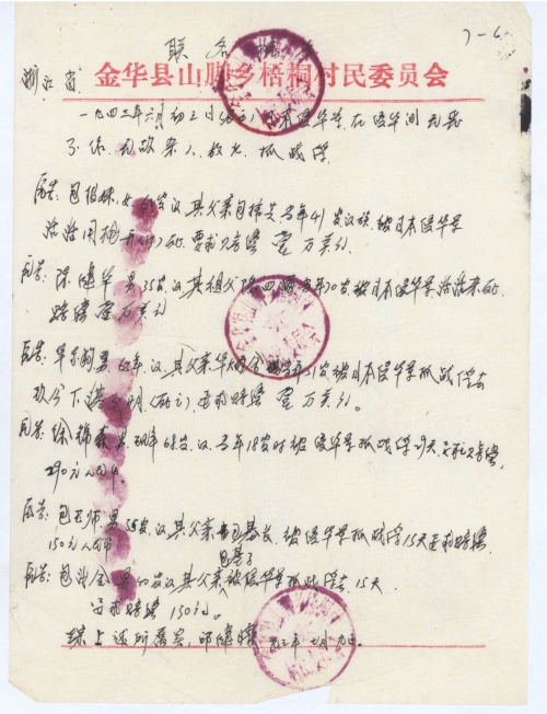 Zhejiang Province Jinhua County Shanjiao Town Wutong Villagers Committee (Seal of Villagers Committee)