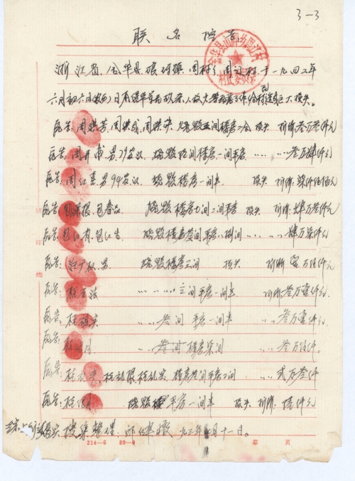 Plaintiff: Zhang Zhonghai (handprint), (Zifang’s grandfather) lost six 2-storied houses, all daily articles and production tools in the house were burned  Loss Equivalent to: RMB Thirty Thousand yuan only.