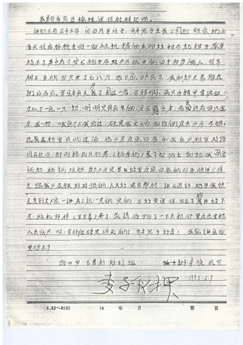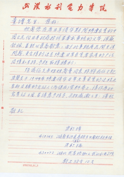 经我们兄弟姐妹商量同意,特将我们父亲皮楚支于1944年惨遭侵华日军无辜杀害的过程及当时目睹的见证人(尚健在)资料寄上,请作为研究查证之用,并请惠予知道,不胜感激之至!谨致