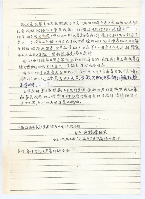 我父亲皮楚支又名皮献政,于公元一九四四年七月中旬在第四次湘北会战时,被侵华日军来我家,打闹抢劫财物之时掳去。抬未,由于我父年老(当时五十岁)又身患隐疾(痔漏,脱肛)而不能[去]当苦力,于次日上午被日兵杀死于长沙县境内的上杉市陈家坳上,后由邻里报信,始抬送回家,全身血渍斑斑,刀痕累累,一共杀了八刀(头,腹,胸,背各二刀)且刀口生蛆,十指断裂,真是惨不忍睹!