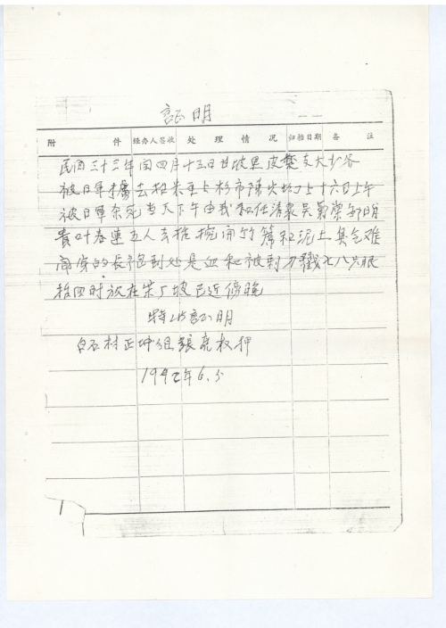 现我父惨遭日军屠杀已四十八年!当时他上有七旬高[龄]的老父母,下有未成年的子女六人。老者丧子,幼儿失父,合家悲哭终日,肝肠寸断,惨痛岁月,至今不堪回首。