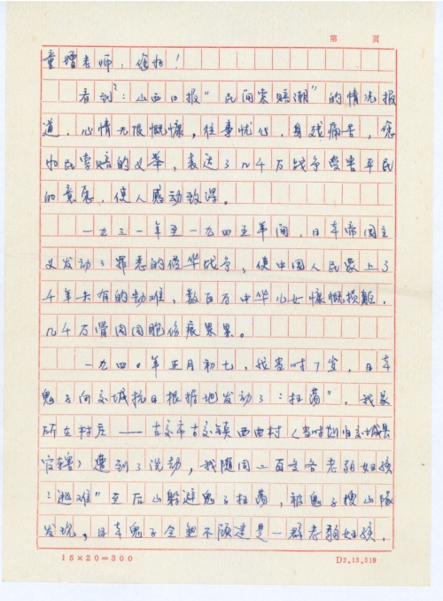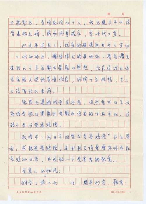 我请求“向日本国要求受害赔偿”书上签名,求得受害赔偿。并积极支持童增老师为民赔偿的义举,并顺致一个受害者的敬意。