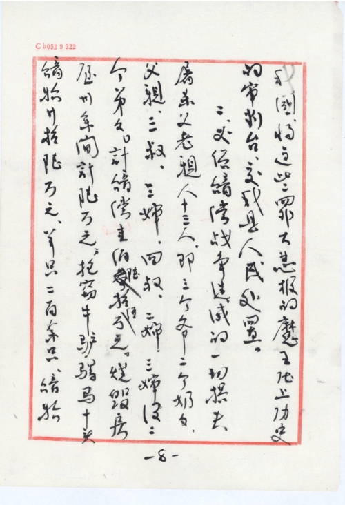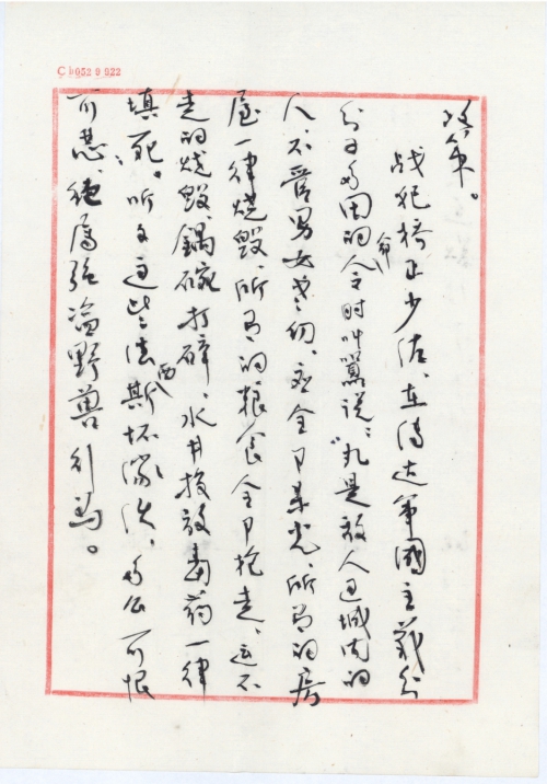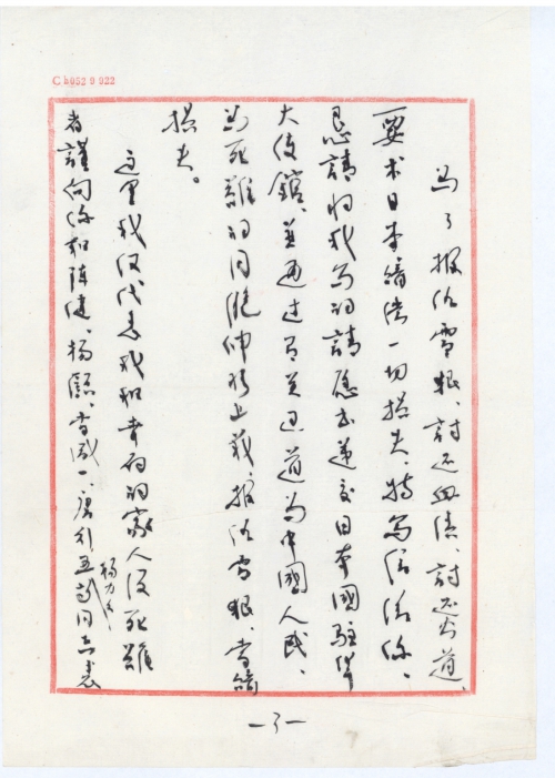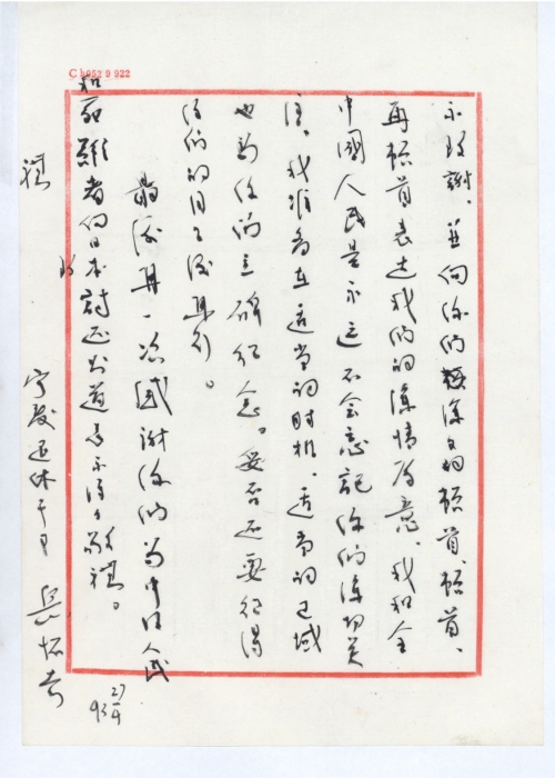 Here I’d like to express gratitude to you and other comrades including Chen Jian, Yang Yuan, Li Chengyi, Tang Yinwu and Yang Liwen on behalf of my family members, both dead and alive. The Chinese people over all the country will never forget your concern for us. I am planning to build a memorial for you in a proper place at a proper time. But I need your approval first.