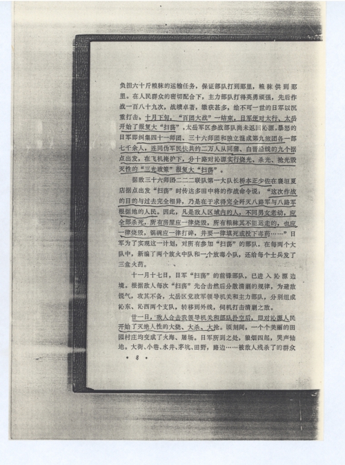 On November 7, the Japanese front troops entered the border of Qinyuan. To surprise the enemy, the party, administrative and military leaders and main forces of Tiyue Region were divided into East Qinyuan and West Qinyuan branches and transferred to the outer area to wipe out the enemy. On November 21, after the Japanese army’s attempt to combat our cadres and forces went in vain, they burned, killed and robbed the Qinyuan people. Soon, one after another beautiful villages were turned into flames and slaughterhouses. Flames and cries followed wherever the Japanese army went. People’s corpses were everywhere – the streets, alleys, wells, latrines, fields and roadsides. Most of the livestock such as cattle, donkeys, mules, horses, pigs and sheep was robbed and the rest were cut off limbs and thrown to the woods, attracting crows. The air was filled with a mixed nauseous stench of blood, rotten corpse, and smoke fumes. The smoke from the burning houses, food and firewood floated in the air above the creeks and valleys, lingering for days. At night, not a sound was heard except for the occasional outburst of horselaughs from the Japanese enemy’s camp fire sites while roasting chickens and ducks or killing the civilian. The silence was terrible. In utter horror of such calamity, those villagers hidden in the woods had lost track of how many days and nights had transpired. A beautiful place was turned into a hell.