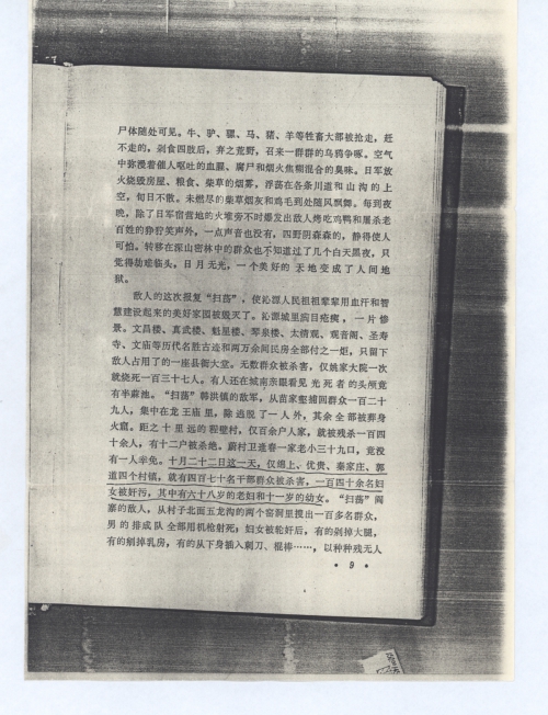 On October 21, the invading Japanese army launched a massive massacre and raid in my county. On that day alone, over 470 innocent people from four villages including Guodao and Qinjiazhuang were cruelly killed by Japanese soldiers. Over 140 women were raped and killed. Over 200 people from Qianjia Village were burned and killed, including over 10 relatives of mine. What a devastating tragedy for both the dead and survivors. I will never forget the hatred and vow to revenge the huge debt of blood. The invading Japanese army’s heinous crimes must be thoroughly punished.