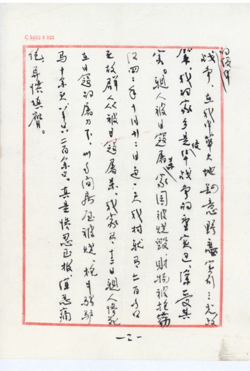 To revenge the injustice and settle the bloody debt, I demand Japan to compensate for all my losses. That’s why I am writing to you and sincerely asking you to submit my petition to the Japanese Embassy in China and pursue justice for Chinese victims through related channels.