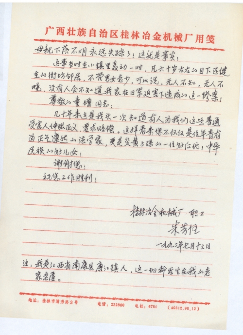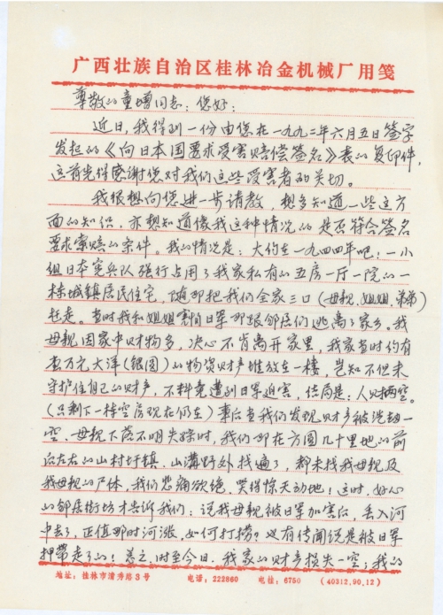 近日,我得到一份由您在一九九二年六月五日签字发起的《向日本国要求受害赔偿签名》表的复印件,这首先得感谢您对我们这些受害者的关切。