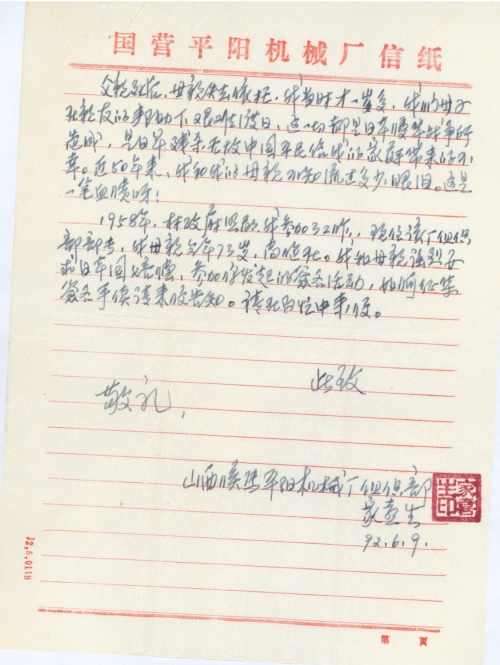 1958年,村政府照顾我参加了工作,现住该厂组织部部门,我母亲今年73岁,尚健在。我和母亲强烈要求日本国赔偿,参加你发起的签名活动,如何征集签名手续请来信告知。请在百忙中来信。
