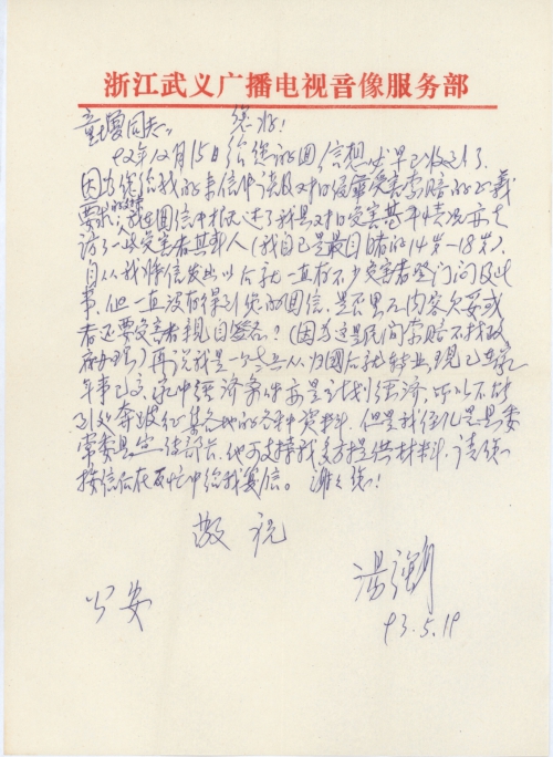 92年12月15日给您的回信想必早已收到了。因为您给我的来信中涉及对日侵华受害索赔的正义要求的支持,我在回信中概述了我县对日受害基本情况亦走访了一些受害者其本人(我自己是最目睹的14岁-18岁)。自从我将信发出以后就一直有不少受害者登门问及此事,但一直没有得到您的回信。是否里面内容欠妥或者还要受害者亲自签名?(因为这是民间索赔,不找政府办理)再说我是一个老兵,从归国后就转业,现已在家,年事已高,家中经济条件亦是计划经济,所以不能到处奔波征集各地的各种资料。但是我侄儿是县委常委县宣传部长,他可支持我多方提供材料,请您接信后在百忙中给我复信。谢谢您!