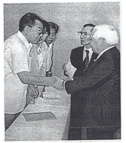 译:和韩馆长(左)握手的山本明司(前高知县议会议长)
