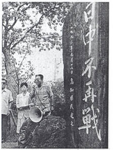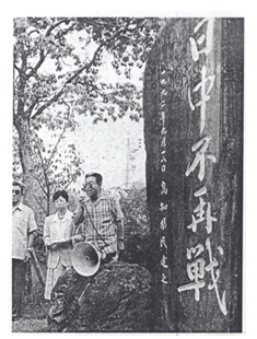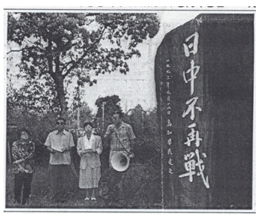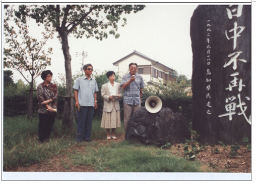 日中不再戦の碑は昭和四十二年に籐並公園に木柱で建て、正式な碑はようやく二年前に桜馬場に建立された。この日はまず世話人の上田栄蔵さんが「きょうは日本軍が戦争に突入した日。軍事大国化への道を進もうとしている今こそ、この碑が価値あるものとなったている」とあいさつ。建立の経過を説明した。続いて韓館長が「不再戦の碑を見ることができ、一層喜びの気持ちが募っている。この碑は中日両国人民の友好の(あかし)。両国の人民がしっかりとこの友好を続けていくことを祈る」とあいさつ、約六十人の出席者から大きな拍手を受けた。
